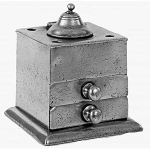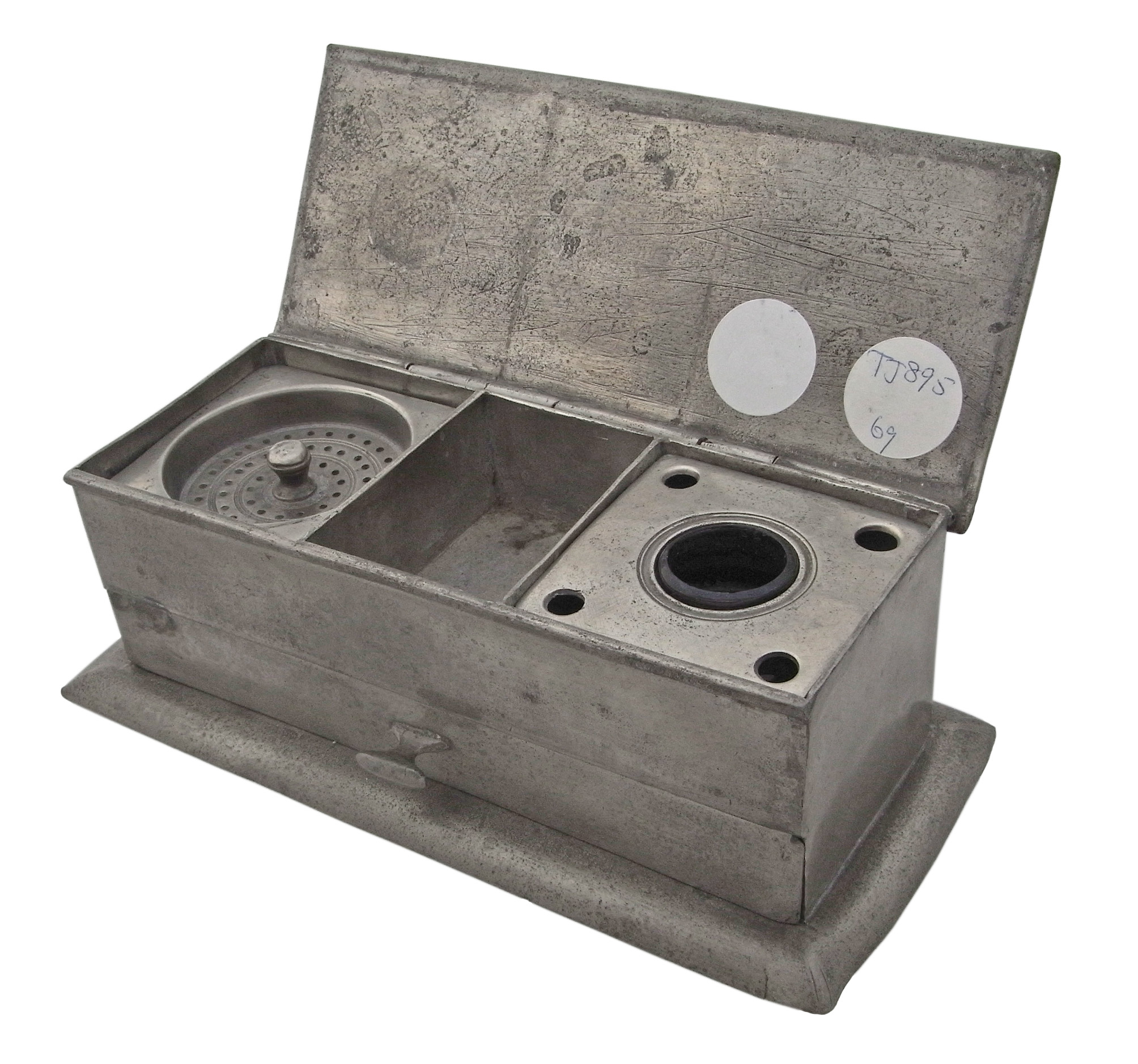 A popular style in pewter was a flat box with two lifting flaps, one covering a long container for the storage of pens, the other covering two, three or four compartments for ink pots, seals and a pounce pot. These are known as Treasury inkstands because some silver ones were ordered for the Treasury in the late C17, but the earliest surviving pewter examples date from mid C18. They were still being made at the end of C19, with reproductions continuing into C20. A variant that is encountered rather less frequently has only a single flap but with a drawer beneath.