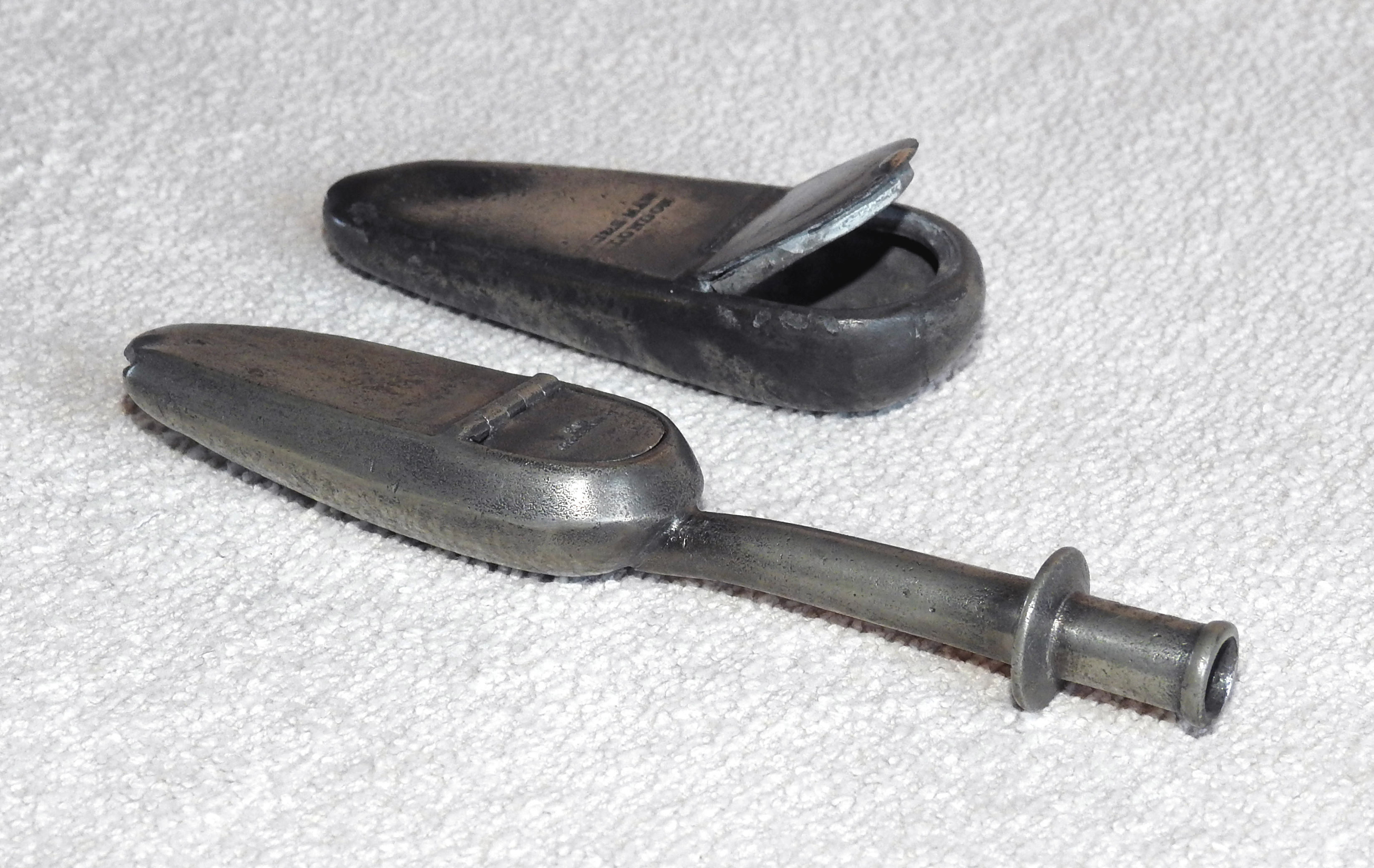 Pewter Syringes come in many sizes and one hopes that the larger ones were for veterinary purposes only! Items recovered from wrecks such as The Mary Rose have shed new light on exactly what was carried to war by the barber surgeon but we still cannot be sure of their exact use. Those with very long thin nozzel attachments might well have been used for flushing out wounds but instilling “mercury”, up the urethra, probably as mercuric chloride cream, as a misguided treatment of syphilis was certainly a common practice and not surprisingly urethral syringes have survived better than their original owners. Enema syringes are usually easily identified and there were even automatic clockwork ones which instilled the flushing fluid and played a tune whilst doing so, though these were French!