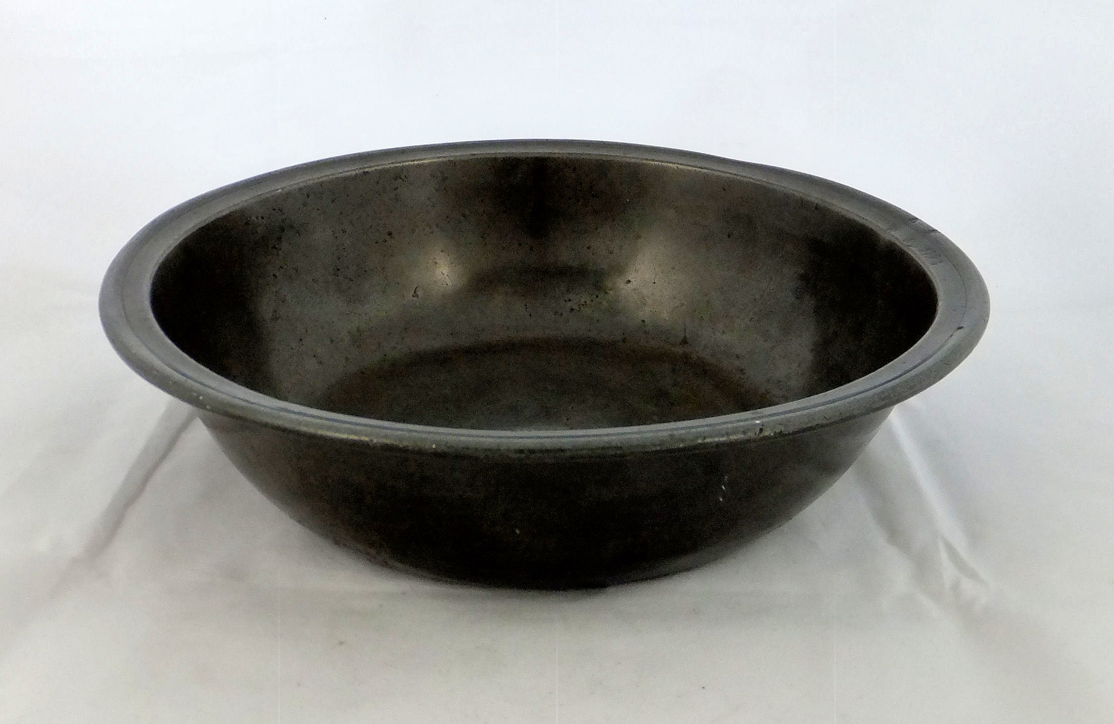Large narrow-rimmed bowls usually date from the late C18th to the early C19th. A hammered bouge suggests British, not continental manufacture. They were often exported to America, where they are called basins but examples turn up in the UK too. Bowls by London and Glasgow makers occur most often, but they were probably made more widely.The use of four ownership initials, rather than a triad, is common in Scotland,but it can also occur elsewhere, especially on church pieces.