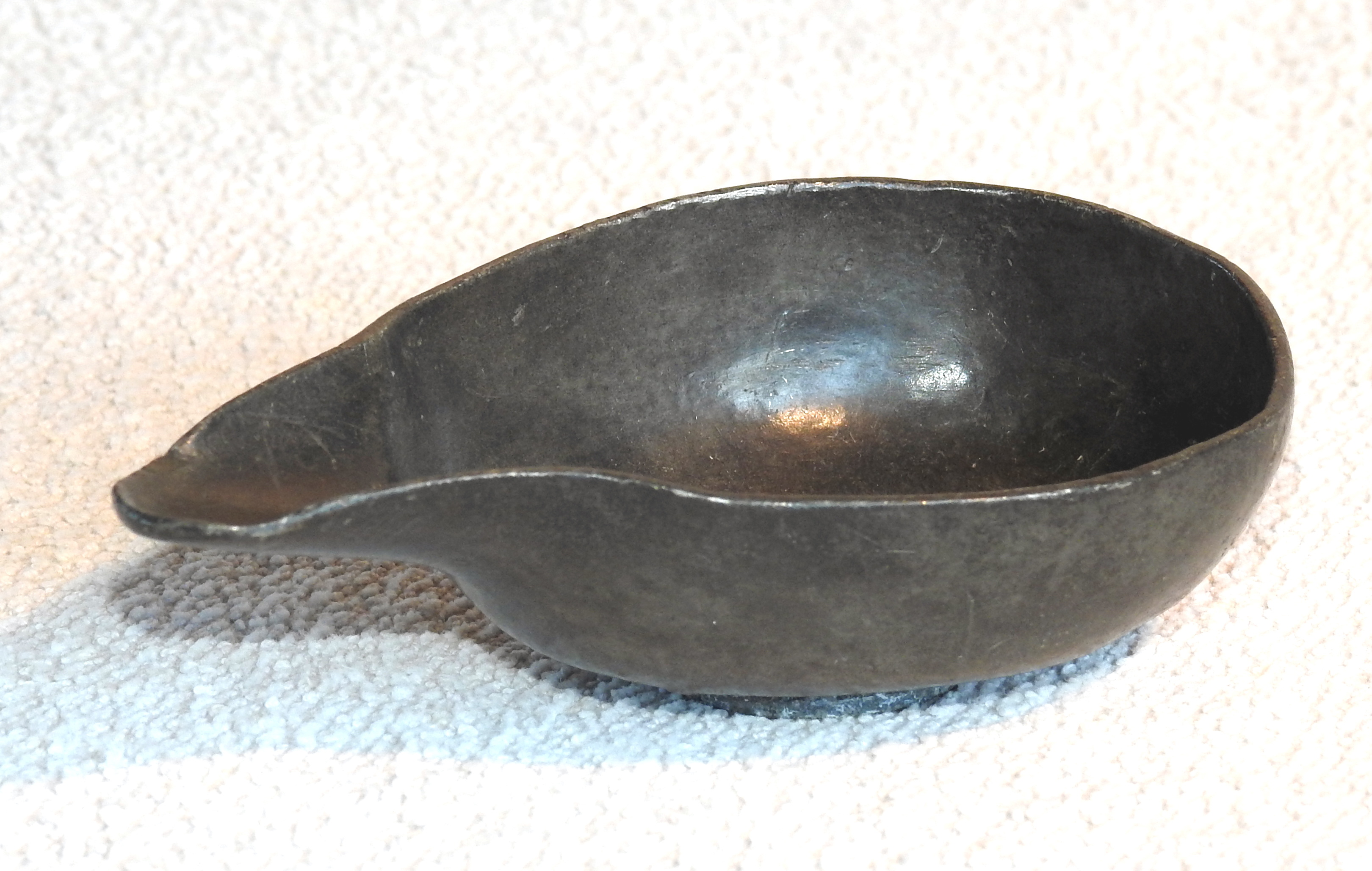 The Pap Boat was a simpler device for giving feeble folk semi-liquid food, and sadly an easier one to forge, so most are 20th C reproductions often with “Dent” or a hospital name on their handle. More sophisticated feeding mugs with extended pouring spouts come in many forms being made by Thomas Compton about 1860 and carrying the War Department broad arrow.