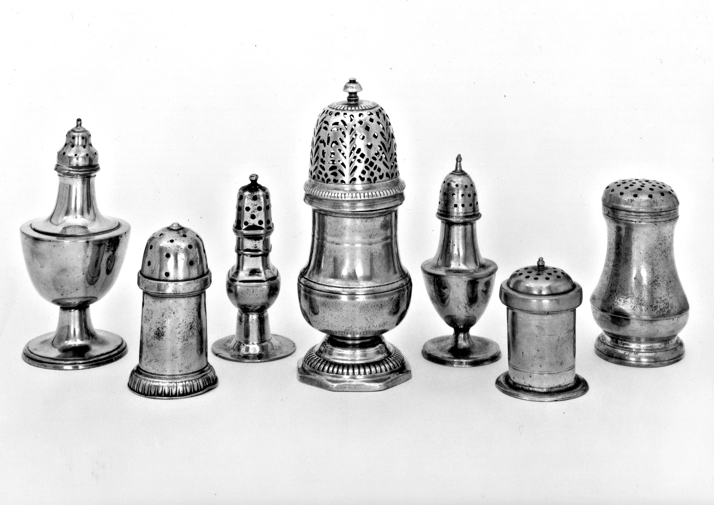 Spices, prior to 1800, were used frequently at the table, for our forebears needed the pungent flavours to hide some of the less pleasant tastes of the salted or smoked meat and fish which for much of the year was all that was available. Ginger and cinnamon were the most popular spices.In the eighteenth century small spice boxes were used on European tables while in the late eighteenth and nineteenth century baluster shaped lidded spice pots with loose fitting or screw lids were popular.