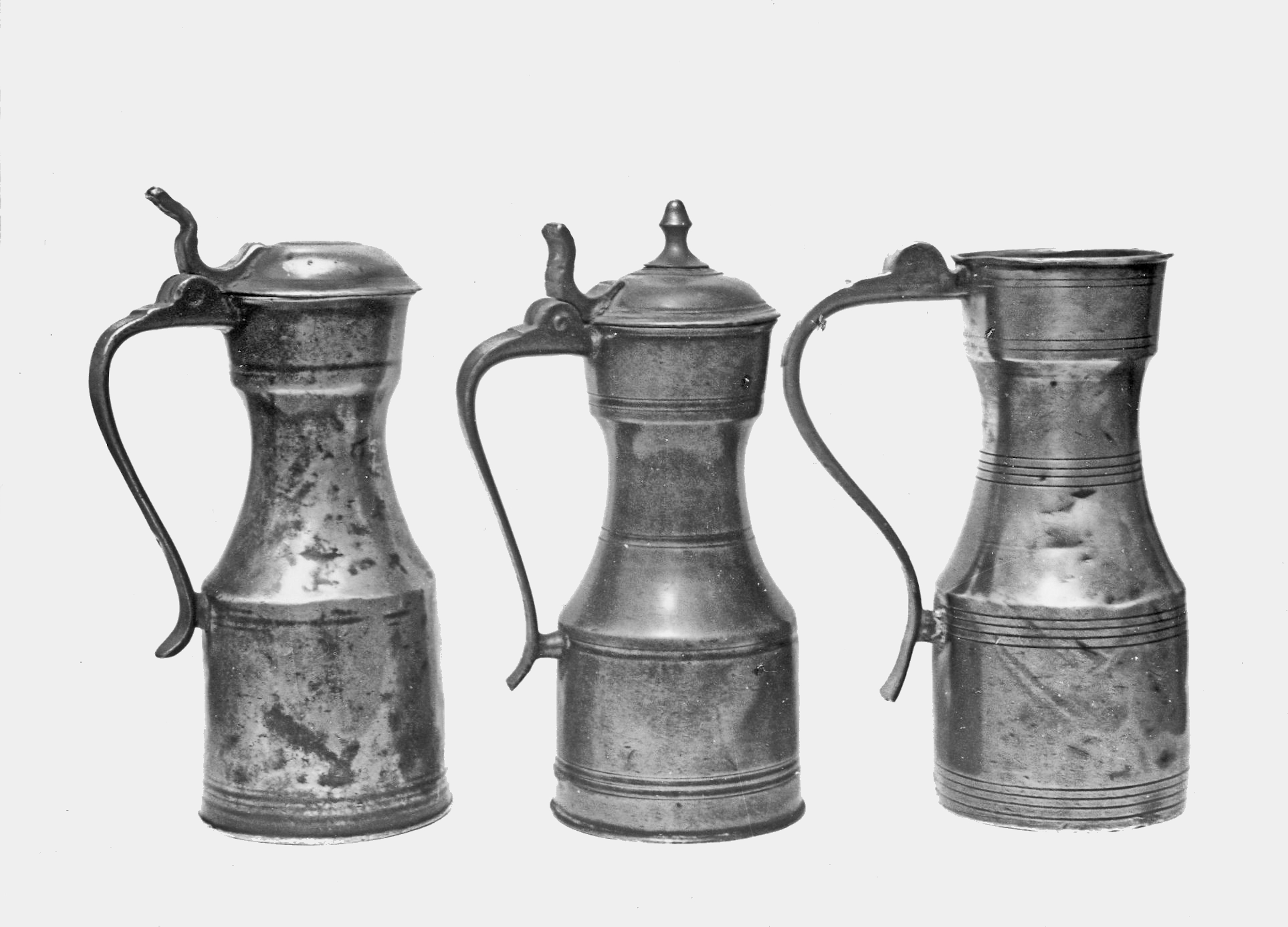 Eighteenth century tavern mugs are uncommon. The tall early form gave way to squat tankards, usually with a ball terminal to their strap handles. Examples before about 1750 tend to differ from maker to maker. About the middle of the eighteenth century, mugs with a “tulip” shape or with “U” shaped body were introduced.